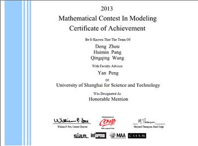 近日,2013年第29届美国大学生数学建模竞赛(Mathematical Contest in Modeling)结果揭晓。由js3845金沙线路周冬、庞慧敏、王青青三名同学组成的代表队以优异的成绩荣获团体Honorable Mentions奖(国际二等奖)的佳绩,该奖项是教育部认可的国际最高级别竞赛奖。代表队由庄院士团队的彭滟副教授担任指导老师。