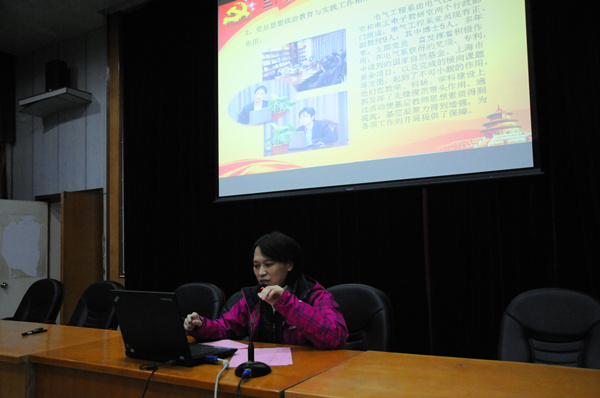 朱莉书记首先做了题为《开拓进取,勇于创新,推动基层党建工作再上新台阶》的工作汇报,光电学院党委2015年认真学习贯彻落实党的十八届四中、五中全会和习近平同志系列讲话等重要精神,结合“三严三实”教育,按照“四个回应要求:回应征求到的师生群众意见,回应对照检查材料查摆的突出问题,回应专题民主生活会和专题组织生活会上提出的批评意见,回应上级党组织和督导组点明的问题”的要求,以高度的责任感和使命感,高标准、严要求,扎扎实实地抓好整改落实、建章立制阶段的各项工作。通过认真查摆个人及集体工作中存在的问题,即知即改,真知真改活动成为群众满意工程。朱莉书记在汇报中强调,基层党建无极限,要不断提升光电学院基层党建工作水平,不断创新工作,希望能涌现出更多优秀的、可供借鉴的案例;学院党委将进一步查找工作中的不足,不断加强和改进学院领导班子建设,逐步完善为民务实清廉的长效机制,毫不松懈地抓好整改措施的落实,以更加坚定的信念、更加顽强的努力,推进学院党建工作再上新的台阶!