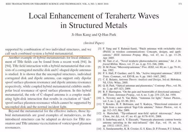 此外,该课题组去年还提出了一种太赫兹频段的高Q微腔激发的新结构(图2(a)),用容易激发的C型谐振腔来间接激发暗态的微腔模式,并在实验中观察到了不同阶数的微腔模式(图2(b))。该成果发表在Nature Group出版集团的Scientific Reports期刊(Scientific Reports, 6, 22027 (2016)),美国加州大学伯克利分校研究人员J.-H. Kang在邀请的综述文章《Local Enhancement of Terahertz Waves in Structured Metals》(IEEE Transactions on Terahertz Science and Technology, 6(3), 371-381, 2016)中对这项工作进行了详细介绍,并认为这是spoof plasmon领域的重要工作(图3),该文章已被美国Notre Dame大学,加拿大蒙特利尔理工学院,英国伦敦大学,意大利比萨NEST纳米科学研究所等研究机构引用14次。