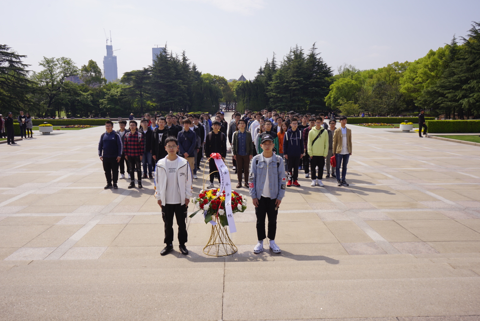 10点20分,光电学院学生代表在纪念碑集合,怀着对这些在战争中牺牲的烈士的崇高敬意开始了严肃、庄重的鲜花祭奠仪式。