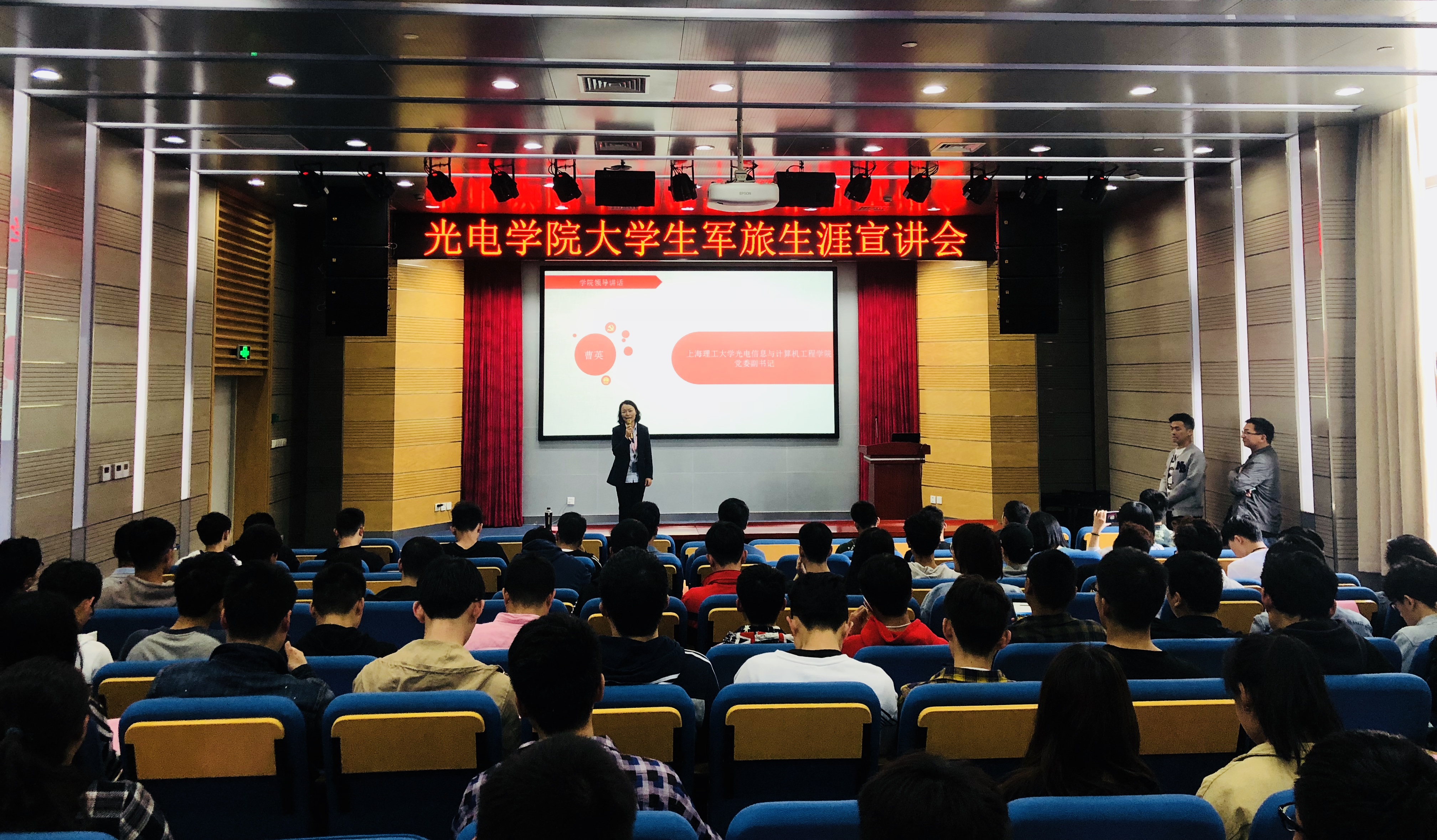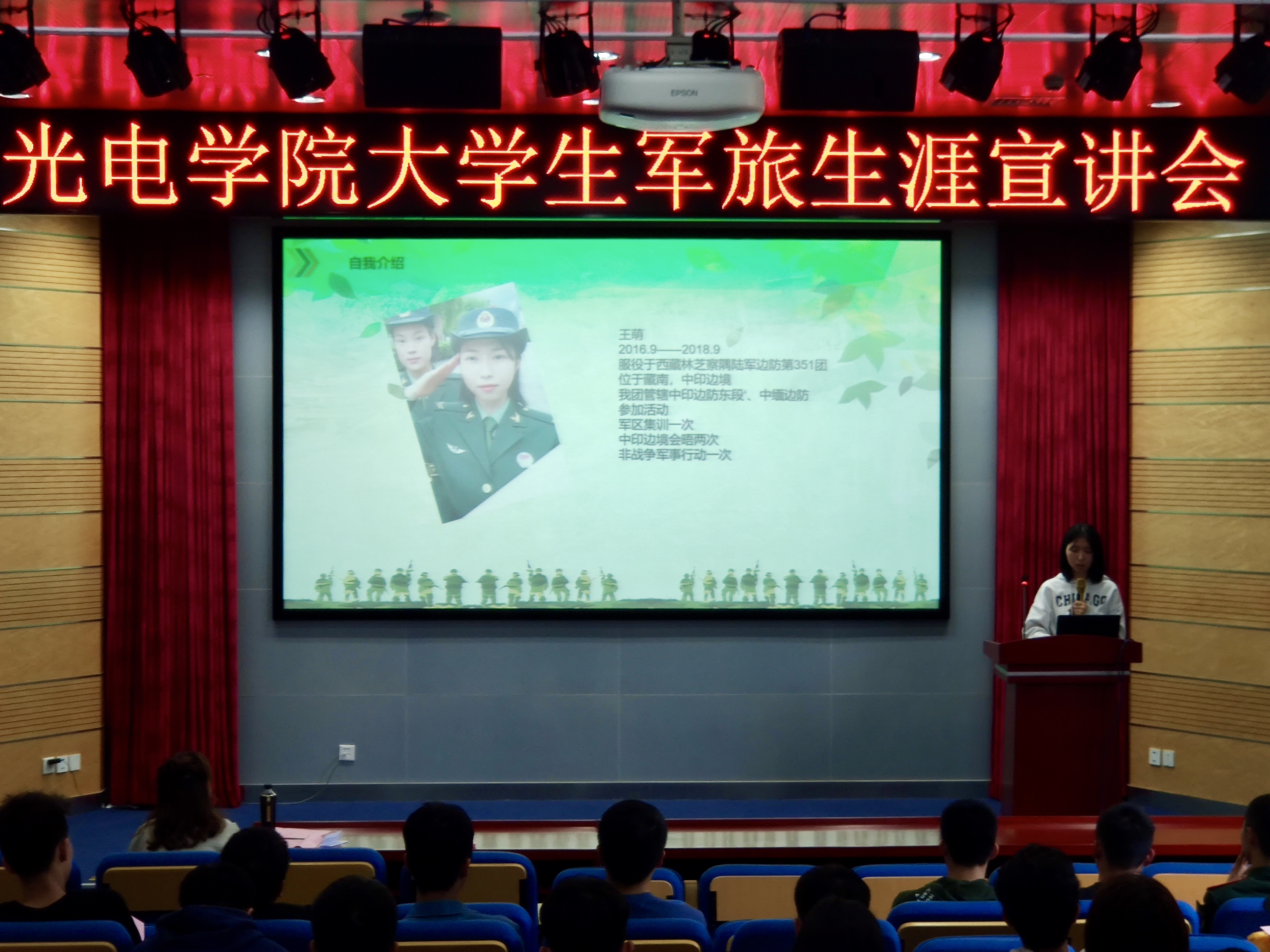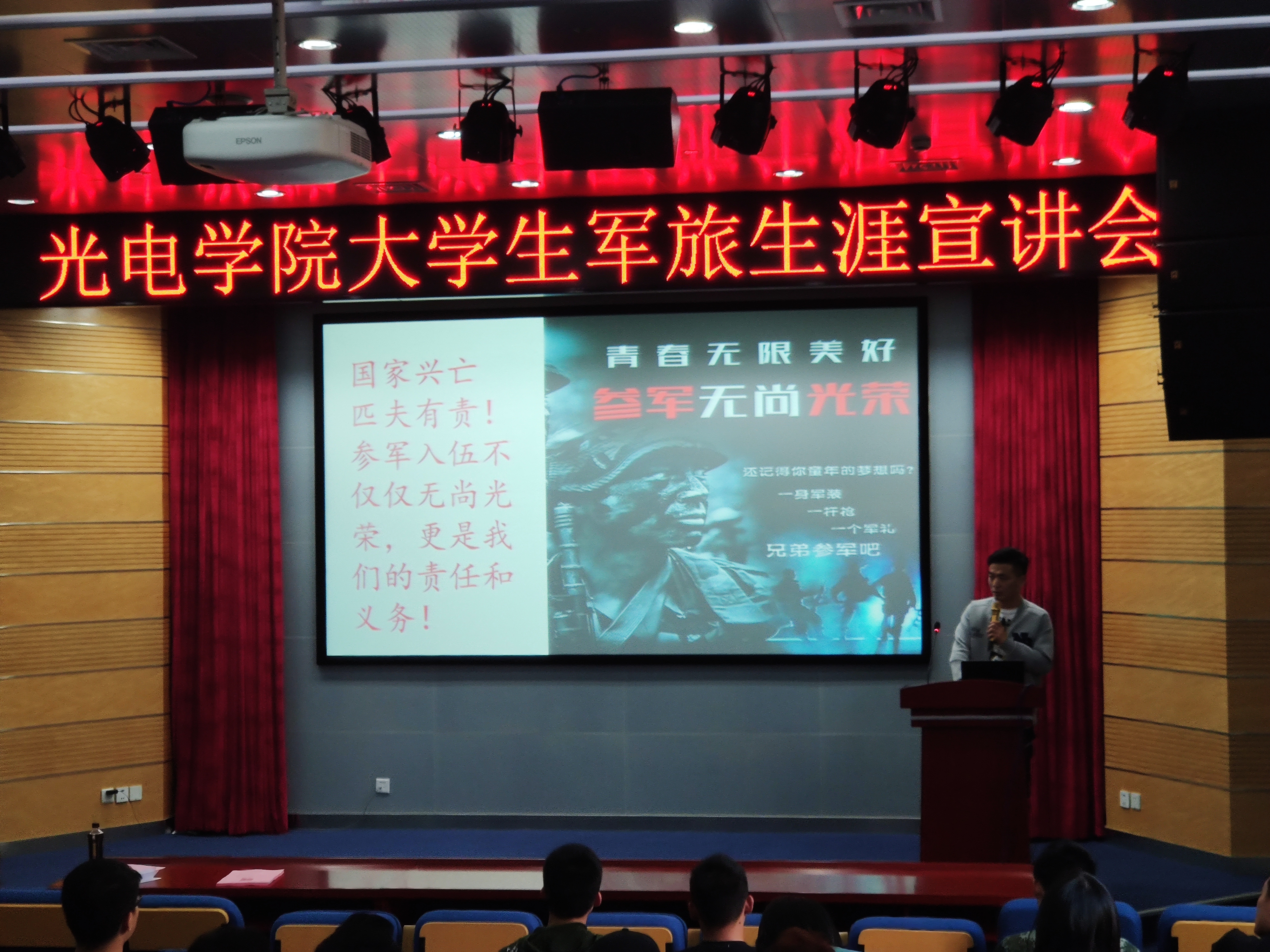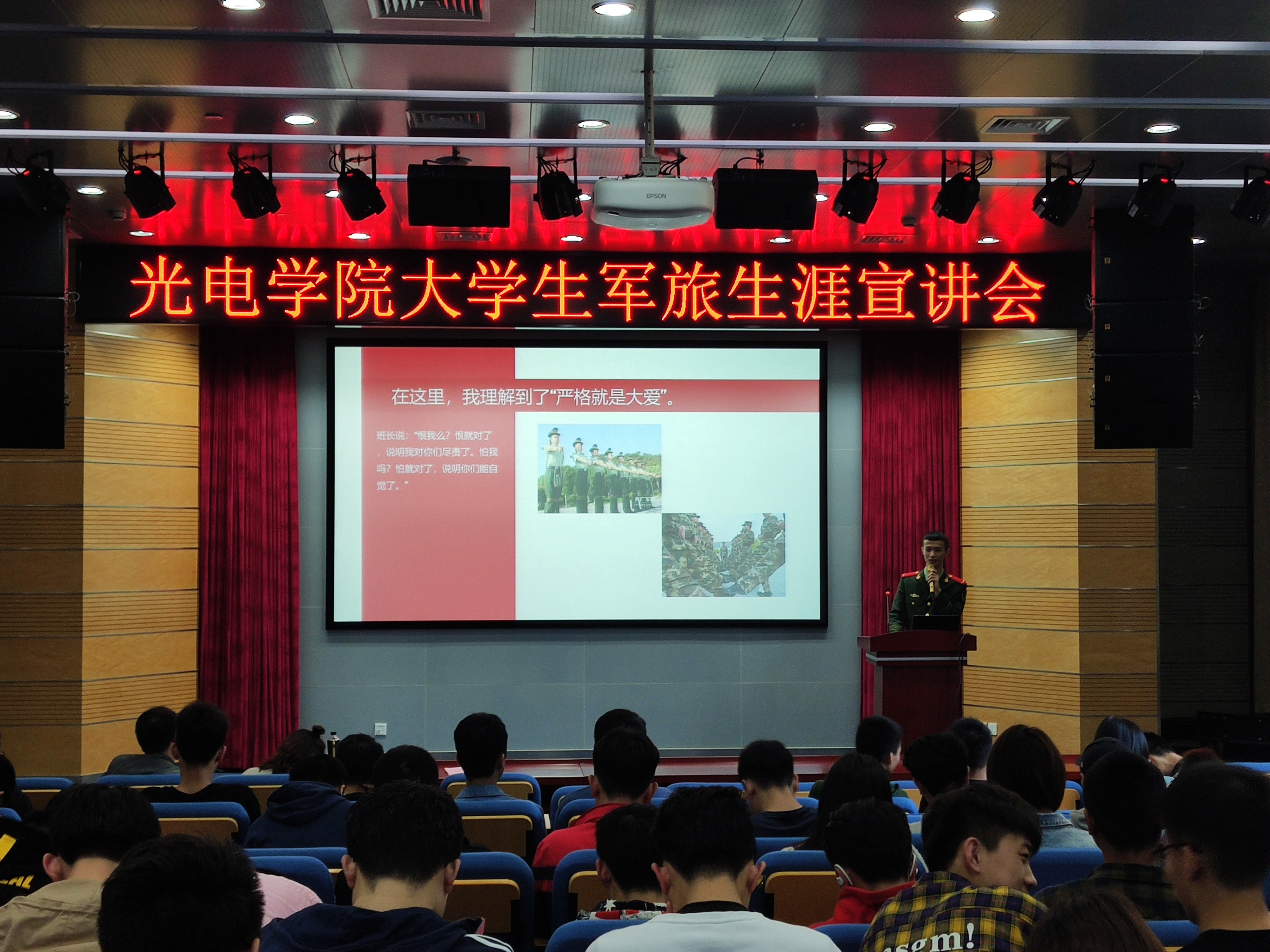 4月19日下午,“热血青春 报国有方”退伍大学生军旅生涯宣讲会在光电楼报告厅举行。光电学院党委副书记曹英,司广文、王萌、刘新、周航四名退伍大学生,各年级学生代表共同参加此次活动。本年度光电学院征兵宣传工作也就此拉开帷幕。