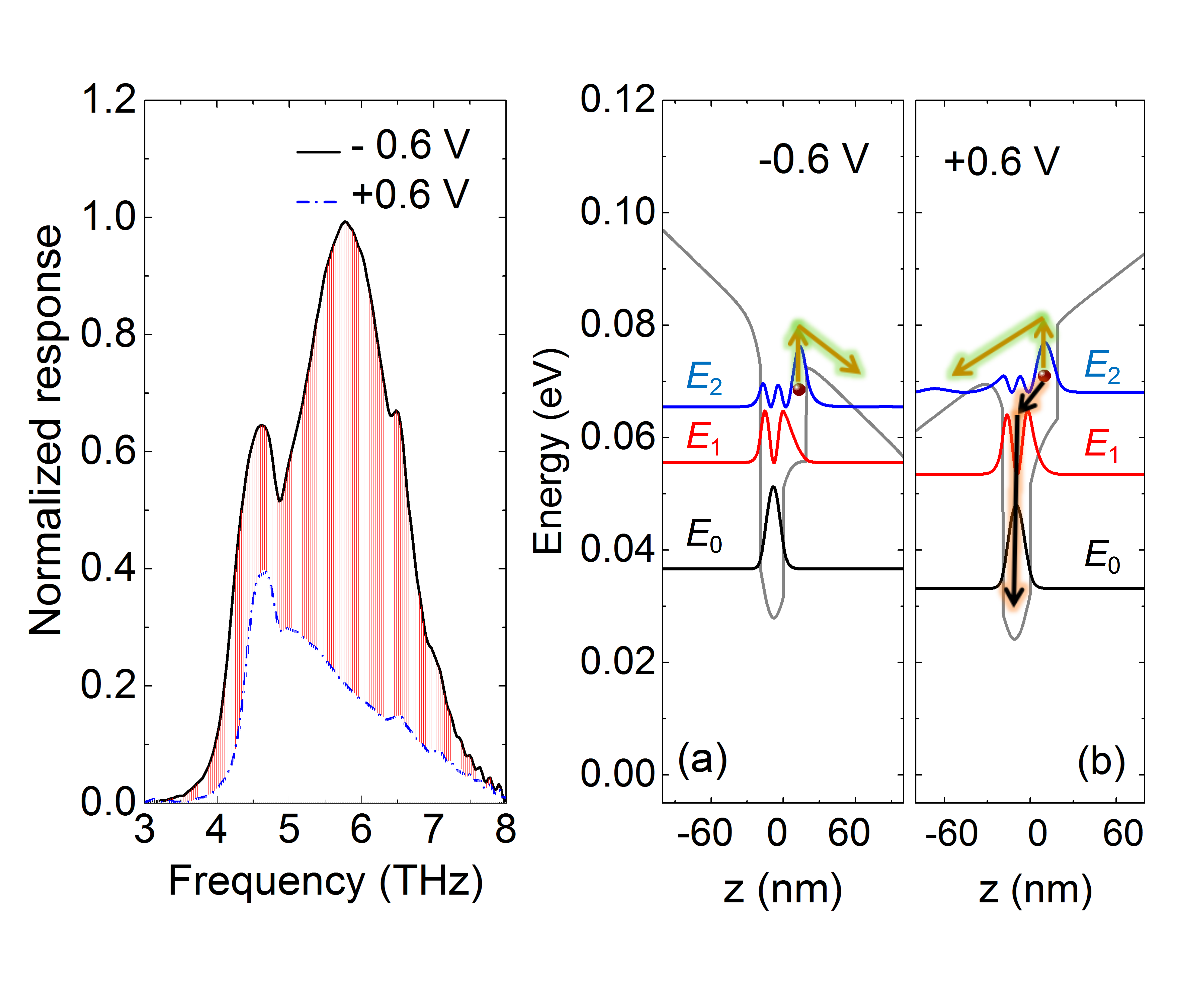 太赫兹量子阱探测器具有响应速度快、探测灵敏度高的优点,其探测机理是利用束缚电子吸收太赫兹光子,在半导体量子阱中子能带间跃迁,改变器件的电导率,从而实现对太赫兹辐射的探测。张桂雪同学与导师团队的工作采用非对称阶梯量子阱结构,打破了子带跃迁选择定则的限制,大幅度提高了探测带宽。同时,还发现该探测器的太赫兹响应谱与偏压极性相关。通过理论计算表明,这种偏压极性相关太赫兹响应谱来源于阶梯量子阱中波函数的不对称性,这为设计新型太赫兹量子器件提供了新的手段。该成果是在我校高水平学科项目资助下取得的。