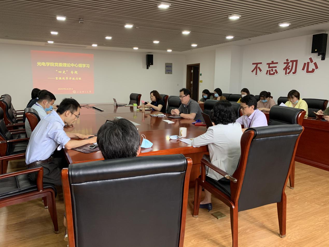 6月23日下午,为更好地落实学校党委关于做好“四史”学习教育工作的要求,光电学院党委中心组在新光电楼1042会议室组织召开了“四史”学习——重温改革开放历程专题学习研讨会。学习会由光电学院党委书记陈海瑾主持。学院党委中心组成员参加了学习,并做交流发言。