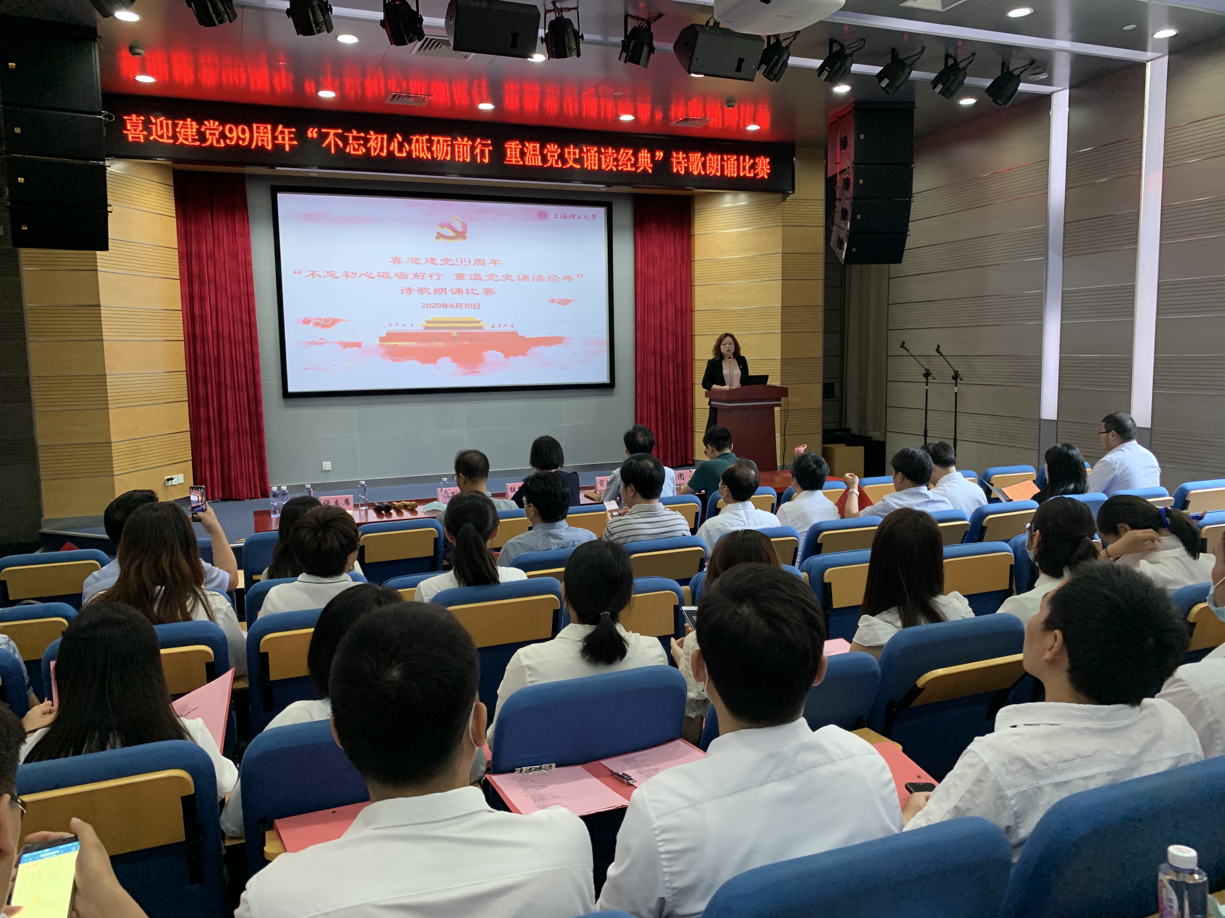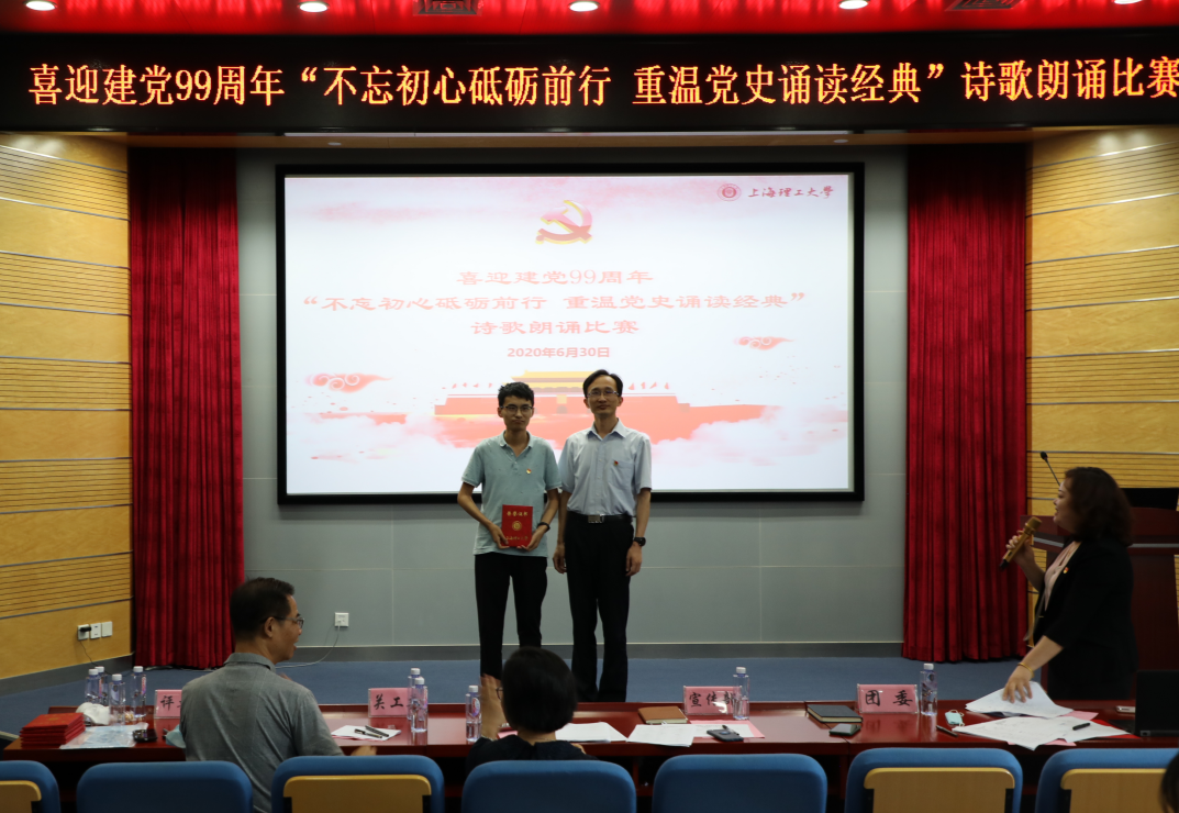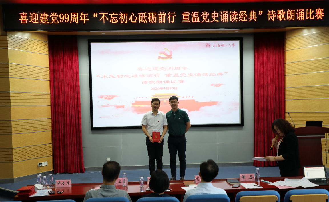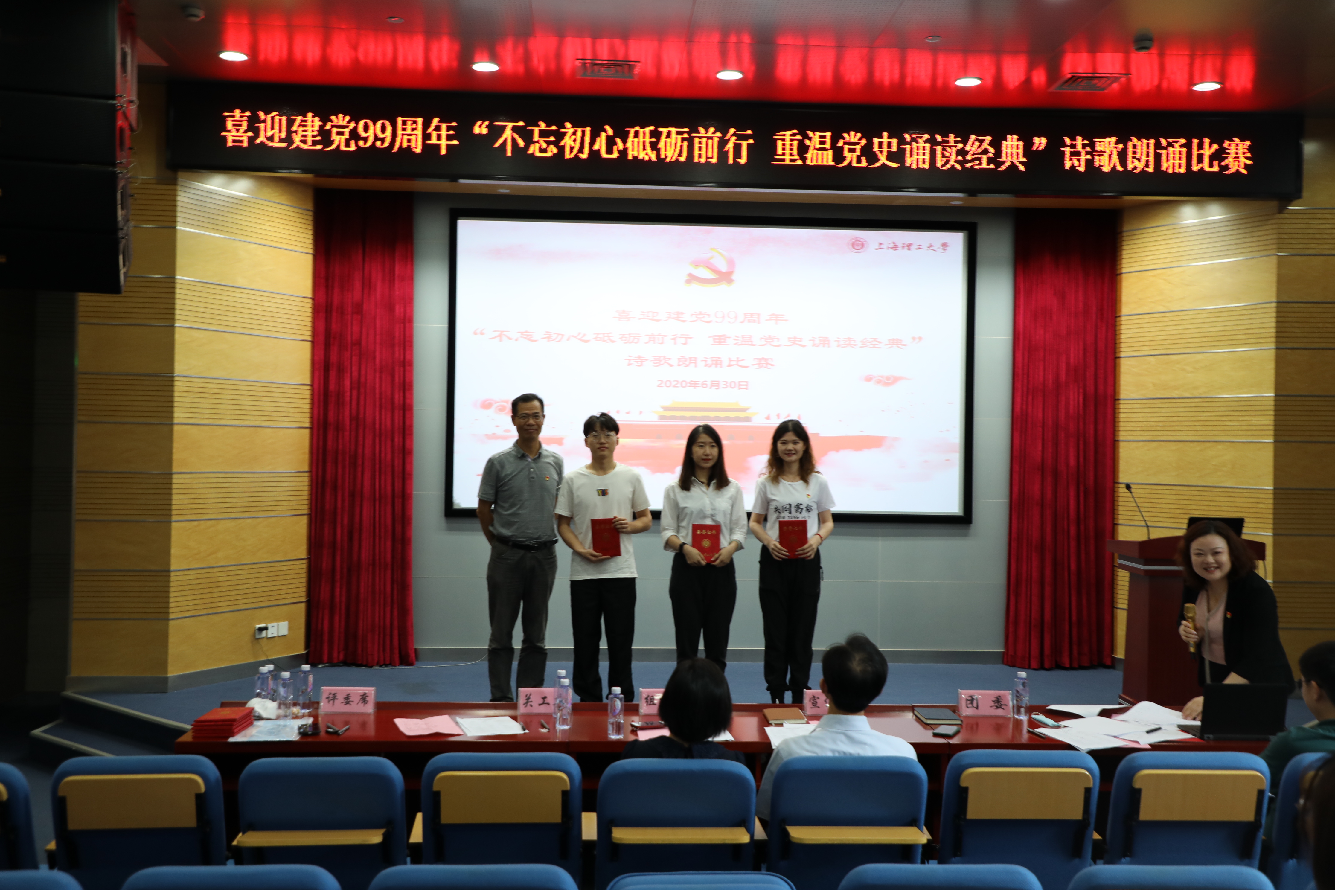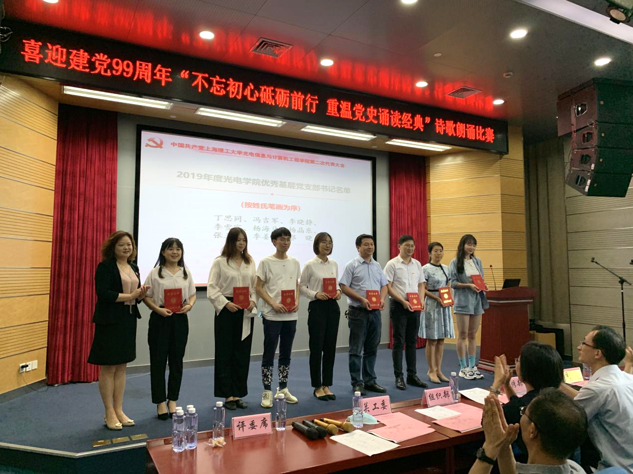 6月30日下午,由js3845金沙线路党委主办的喜迎建党99周年 “不忘初心砥砺前行 重温党史诵读经典”诗歌朗诵比赛在光电报告厅圆满举行。学院党委书记陈海瑾首先宣读了2019年度光电学院优秀基层党支部书记名单,并为获奖的支部书记颁发了荣誉证书。接下来的比赛中,各支参赛队伍围绕“党史”经典主题进行配乐朗诵,党员们精神饱满,神采奕奕,用嘹亮的声音激情诵读,歌颂伟大的党、伟大的祖国,抒发了党员们深深的爱党、爱国情怀,为中国共产党99岁生日献上诚挚的祝福。经过两个多小时激烈的角逐,通过评委现场评分,最终分别从6支教工队伍和13支学生队伍中评选出一等奖2个、二等奖3个、三等奖5个。