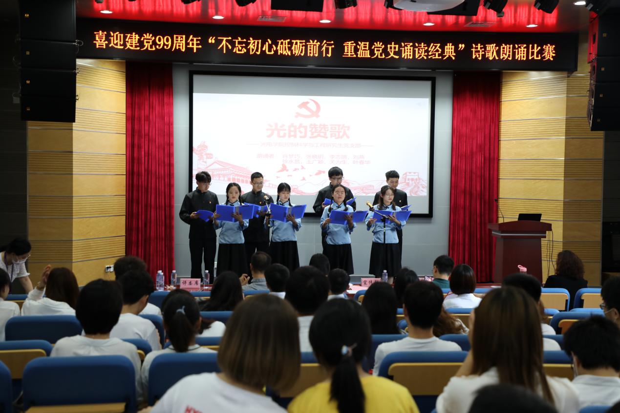 学好党史、新中国史、改革开放史、社会主义发展史是牢记党的初心和使命的重要途径,是党员的一门必修课,也是爱国主义教育的重要组成部分。值此建党99周年之际,光电学院举办了一场七一重温党史诗歌朗诵比赛,让“四史”学习教育愈加入脑入心,在全院师生中掀起了学习“四史”的热潮。