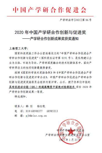 1月23日中国产学研合作促进会【产学研函字(2021)第06号】发布通知。经中国产学研合作创新与促进会组织专家对项目进行评审,我校js3845金沙线路庄松林院士领衔、韩森教授团队攻关的“具有抗扰动功能(QHL)的超高精度平面绝对检测技术”项目荣获2020年中国产学研合作创新成果一等奖。