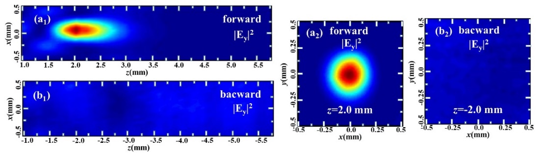 图3.单向聚焦超构表面透镜场分布:(a1),(b1)为0.6THz的太赫兹波分别从背面和正面入射的场分布;(a2),(b2)为在各自透射面聚焦平面上的场分布。