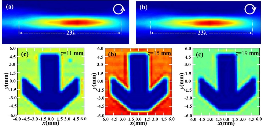 提出了纯几何位相的自旋解耦合的太赫兹超构表面透镜,实现了超构表面透镜对左旋圆和右旋圆偏振太赫兹波的同时聚焦;调节自旋解耦合超构表面透镜对左旋圆和右旋圆偏振太赫兹波的焦距,使得一对正交圆偏振的太赫兹聚焦光斑于一体,形成偏振无关的太赫兹聚焦光斑;进而融合焦深调控于此偏振无关的太赫兹超构表面透镜,形成偏振无关的太赫兹波的超长聚焦焦深(焦深可达23λ)的调控(如图2(a), 2(b)所示),实现纵向高分辨、高宽容性的扫描成像(如图2(c),2(d),2(e)所示).