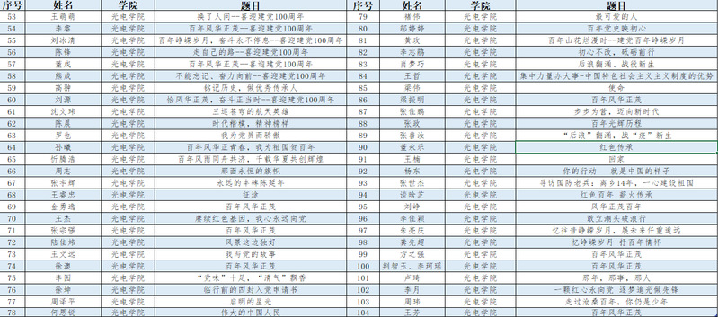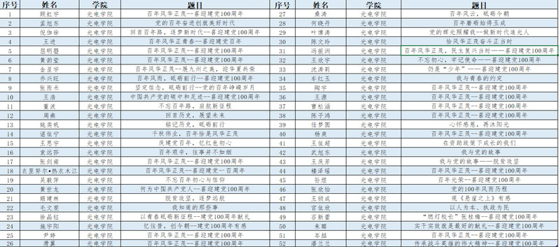 百年党史蕴藏着矢志不渝奋斗的精神密码,彰显着共产党人的卓越智慧,解读着砥砺前行的制胜法宝。为庆祝中国共产党成立100周年,生动展示大学生党员始终牢记为中国人民谋幸福、为中华民族谋复兴的初心和使命,以昂扬姿态奋力开启全面建设社会主义现代化国家新征程,光电学院自4月开展“百年风华正茂--喜迎建党100周年”主题征文活动。此次征文,共收到来自学院21个学生党支部的104篇征文,各位党员围绕我的入党故事、党的百年荣光和党史学习等主题,以征文的形式庆祝中国共产党成立100周年。学院学生会主席、本科生第六党支部党员桑涛谈到:“峥嵘党史,铭刻着无数革命先烈为民族独立和人民解放而奋勇牺牲的斗争历程,深刻认识我们党以斗争精神锤炼革命底色。”