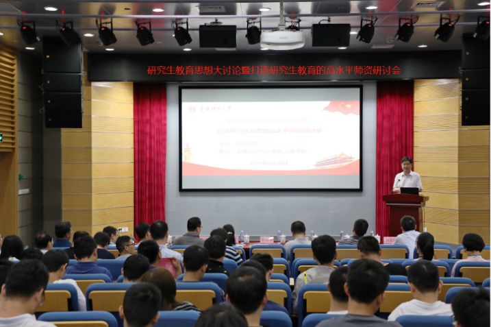 6月30日,由我校研究生院主办,光电学院承办的研究生教育思想大讨论暨“打造研究生教育的高水平师资队伍”研讨会在光电楼报告厅召开。上海理工大学党委副书记孙跃东,研究生院副院长崔国民、郑继红,光电学院全体党政领导,部分研究生导师和研究生代表共计100余人参加本次研讨会。会议邀请了华东师范大学数据科学与工程学院院长钱卫宁教授作主题报告。研讨会由光电学院副院长彭敦陆主持。