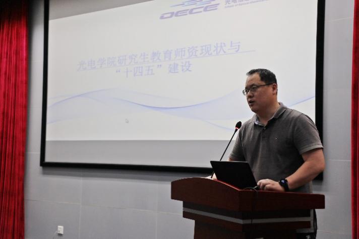 光电学院常务副院长张学典教授作了“光电学院研究生教育师资现状与‘十四五’建设”的主题报告,介绍了光电学院研究生教育师资基本概况、师资学科分布情况、平台优势以及学院近年来的人才引进和团队建设情况。他表示,“十四五”期间,学院将继续加大人才引进力度,特别是加大薄弱学科国家级人才的引进,健全导师考核方法,建立多维度、多层次的考核制度,切实做到“破四唯”与“立新标”相结合,鼓励光电研究院实体团队建设,注重研究生指导教师的思想建设,优化导师结构,积极推进实施研究生联合培养,强化导师育人能力,提升导师导学水平,加强导师导研能力。