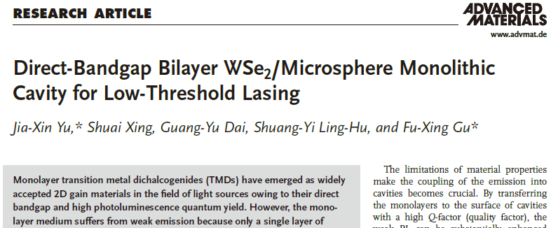 近日,庄松林院士领衔的未来光学实验室、谷付星教授课题组在国际顶级期刊Advanced Materials(影响因子30.849)上发表了题为“用于低阈值激光的直接带隙双层硒化钨(WSe2)/微球一体腔”(”Direct-Bandgap Bilayer WSe2/Microsphere Monolithic Cavity for Low-Threshold Lasing”)的研究成果。该论文由谷付星教授和于佳鑫副教授为共同通讯作者,于佳鑫副教授与博士生邢帅为并列第一作者。该研究工作的方案设计、实验、模拟工作均在上海理工大学未来光学实验室完成。