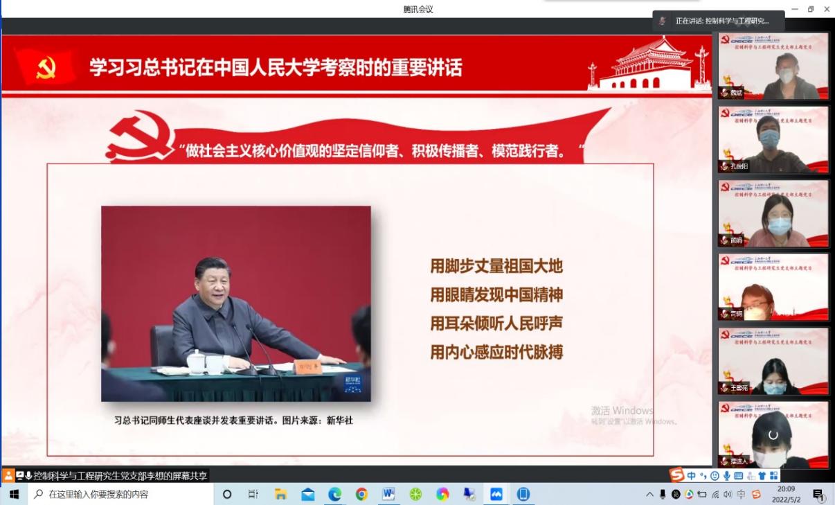为了迎接即将到来的五四青年节,学院20多个师生党支部围绕深入贯彻学习习近平总书记考察中国人民大学重要讲话精神,开展了各具特色的主题党日活动,进一步坚定理想信念,筑牢信仰之基,引导支部和党员用实际行动诠释“一个支部就是一座堡垒、一名党员就是一面旗帜”。5月2日晚,光电学院党委书记袁媛、党委委员宋燕与控制科学与工程研究生党支部党员共同开展“守住防疫成果,勇担青年使命”主题党日。宋燕分享了在社区参与抗疫的感悟和居家科研的方法,她指出,作为一名青年党员,要弘扬五四精神,拼搏、创新、进取,既要积极投身抗疫一线,也要牢记学生职责,学习科研不能丢。袁媛向同学们提前致以节日的问候,对支部学生党员积极服从学校疫情防控规定,奋勇争先参与志愿服务的辛苦付出表示肯定与感谢,并强调,当前处于疫情防控攻坚阶段,同学们不能放松警惕,要做好时间管理和心理调适,与学校共同完成疫情大考;要谨遵总书记的殷切教诲,在青春的赛道上跑出当代青年的最好成绩。