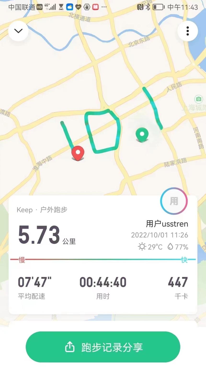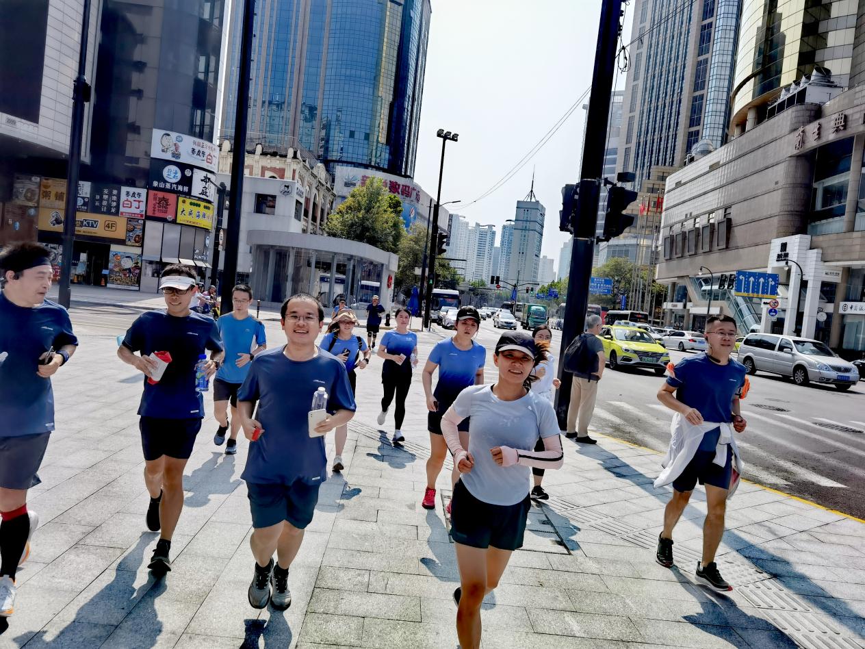 活动当天,最高气温达到了31℃,跑团成员坚持不懈,以昂扬的奋进姿态和饱满的精神活力,共同完成了“10.1”的跑步路线图。柳强老师分享了参与健康跑活动的感受:“跑步不仅是一项运动,还是一个挑战自己的过程,正值祖国73岁生日,这一场跑步变得更加有意义,我们用脚步丈量时代的进步,用踔厉奋进的姿态庆祝祖国的生日”。团长刘一谈道,“10月1日当天,从石库门出发,跑过百年前的上海滩,跑过林荫大道,跑过摩天楼观,最后在复兴路校区结束跑团首秀,具有特殊的意义,我们在复兴路上祝愿祖国繁荣昌盛。”