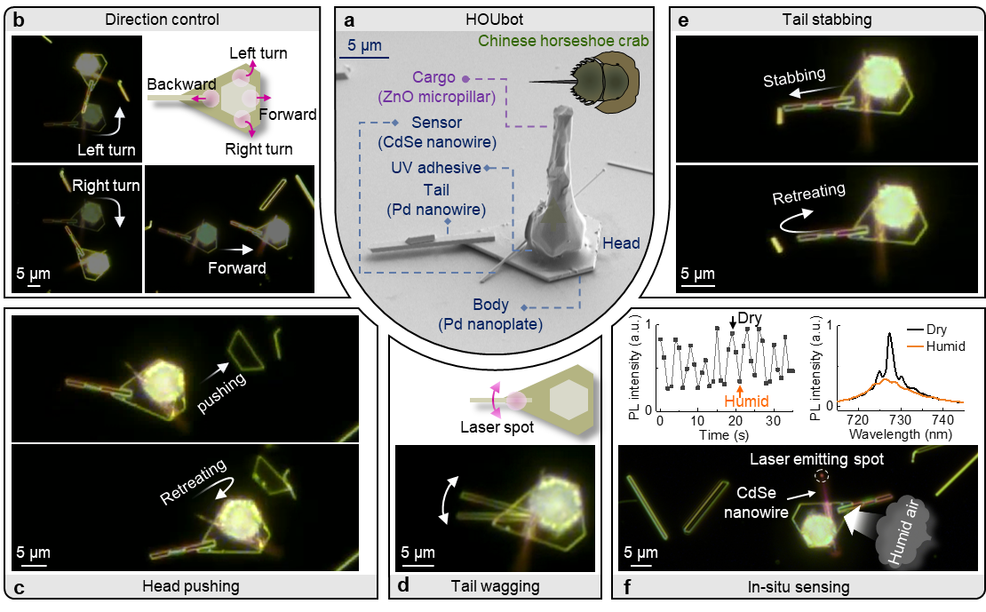 研究人员又利用金属钯纳米片为底盘搭建了一个结构更复杂、功能更多样的纳米机器人,因形似中华鲎,被称为HOUbot(图4a及视频)。该机器人能像汽车一样自由移动 (图4b),并做出头部推动(图4c)、独立尾部摇摆(图4d)和戳刺(图4e)等更高自由度和精细的动作。机器人身上搭载半导体纳米线可用于原位湿度传感(图4f)。由于其相对较大的表面,该机器人具有很强负载能力,理论有效载荷可以达到毫克量级(相当于一只蚂蚁的质量)。通过采用现有的宏观机械设计来装备更多的机载组件或货物,HOUbot可以像宏观机器人一样工作,是世界首个利用传统机械手段实现的可执行具体任务的纳米机器人。