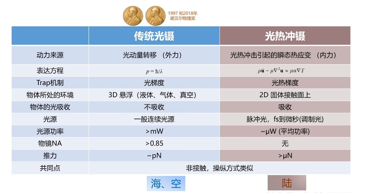 光热冲镊技术的发明使得激光操纵突破了界面阻力困境,补全了光操纵的应用环境,使得激光最终实现了可在堪比海陆空三界(真空/气体,液体及固体)的微纳环境中任意操控物体 (图5)。在物理上,则聚焦了瞬态热弹性动力学和摩擦学,特别是非破坏性研究,这进一步揭示微观领域机械动力过程的理解。该技术原理上可以用于任何波长范围和任何可吸收材料。此外,通过空间光调制和多机器人协作,可以实现自主纳米机器人集群,完成目前常规手段不能实现的复杂任务。该技术有望在纳米制造、生物医学、航空航天及军事等各个领域发掘出前所未有的应用场景。