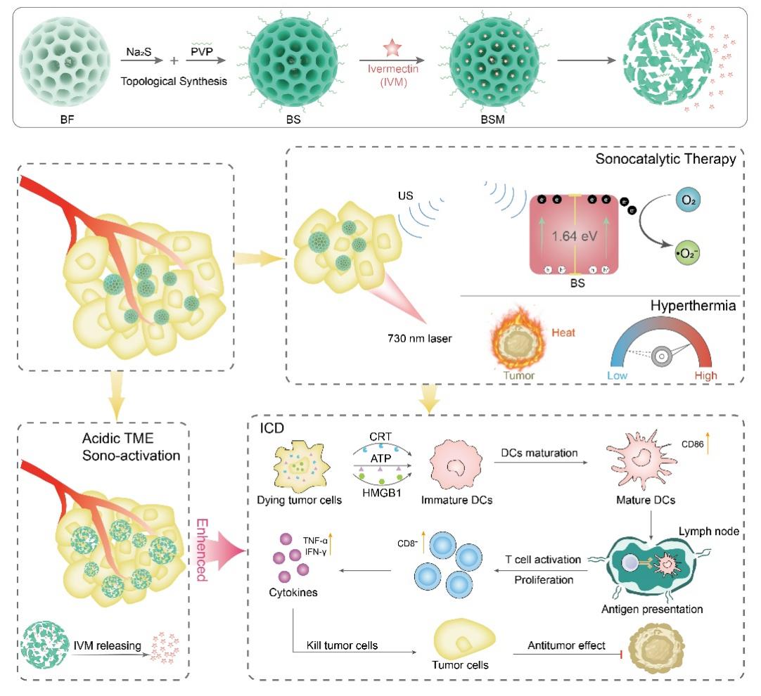 近日,上海理工大学庄松林院士、张大伟教授领导的超精密光学制造创新团队通过拓扑合成策略将宽带隙的氟化铋纳米材料调控为一种窄带隙的硫掺杂氧化铋纳米材料,用于免疫原性细胞死亡介导的肿瘤免疫治疗。研究结果表明,超声刺激下硫掺杂氧化铋纳米材料具有更高的电子-空穴分离效率,可以产生更多的活性氧物种;硫元素的掺杂能够扩展其光吸收范围,使其在730纳米的光照下具有良好的光热转换性能;释放的铋离子将会与肿瘤微环境中过表达的谷胱甘肽反应,放大肿瘤细胞的氧化应激;利用其介孔结构装载伊维菌素药物,进一步增强肿瘤细胞的免疫原性死亡,最终实现更加有效的免疫应答。