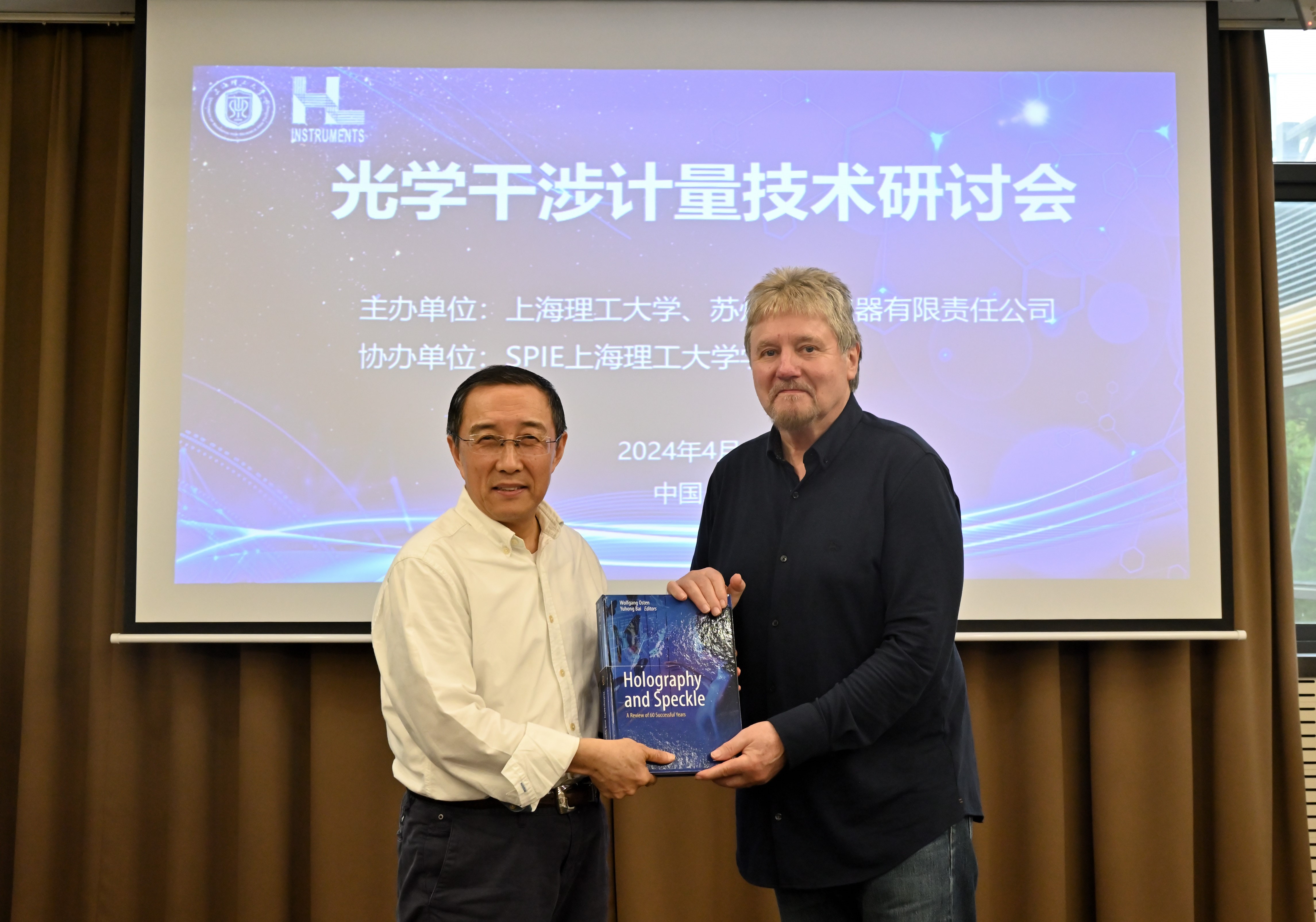 最后,上海理工大学博士生张凌华同学,SPIE上海理工大学学生分会主席沈宇航同学、副主席杨颖同学分别带来他们在光学干涉计量领域的学术报告分享。Wolfgang Osten教授赠予韩森教授他的新书《Holography and Speckle》,并合影留念。
