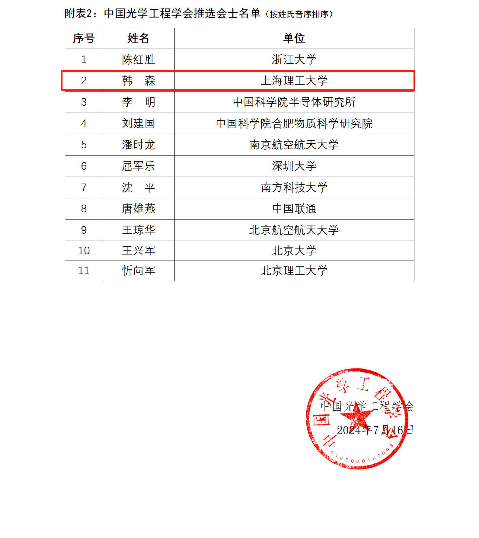 近期,中国光学工程学会公布了2024年度中国光学工程学会会士名单,上海理工大学韩森教授被授予“中国光学工程学会会士”的称号。