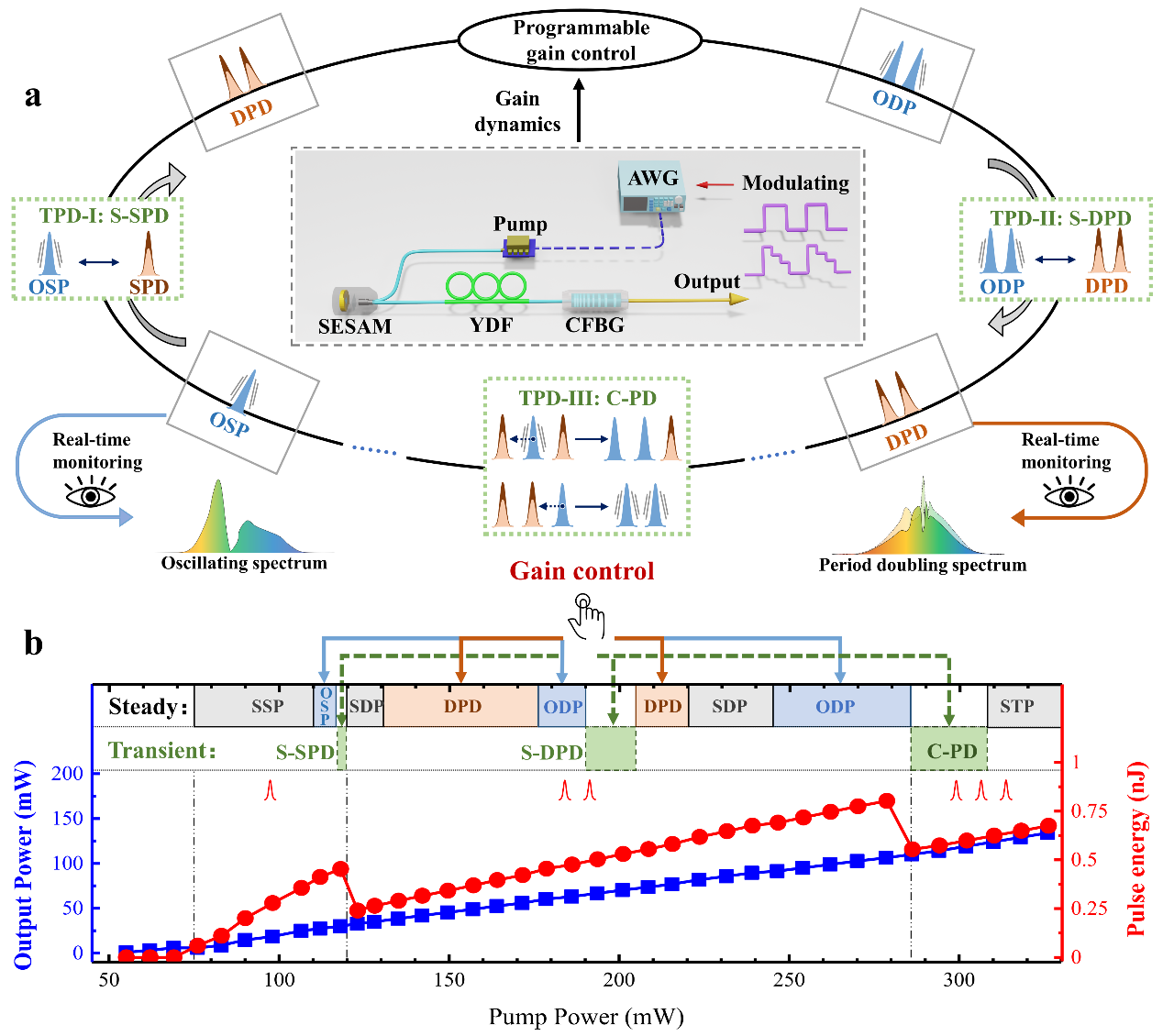 周期加倍分岔是混沌理论的重要概念,可以作为复杂系统从有序进入无序的典型方式,在经济学、生态研究和流体动力学中都有直观体现。但是,目前为止,周期加倍分岔孤子的研究仍局限于自维持的准稳态,对其动态规律还知之甚少。上海理工大学与华东师范大学、香港大学合作,采用全保偏可饱和吸收体锁模的光纤激光器作为研究对象,有效避免温度、震动等环境变化导致的偏振态扰动。实验中,通过调节泵浦功率实现增益控制,精确操控光纤激光器中各类孤子的产生和切换,尤其是首次实现了周期加倍孤子与其他孤子的状态切换与编码,编码速率达到千赫兹量级,相比以往通过手动偏振态控制实现的编码速率大幅提升。
