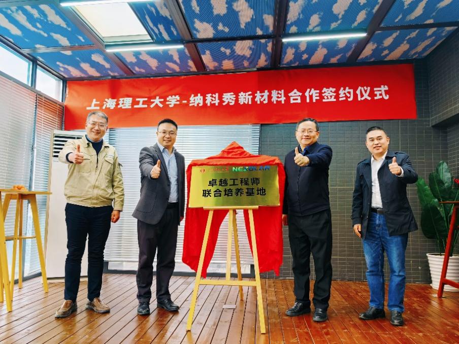 1月7日下午,我校与上海纳科秀新材料有限公司(以下简称“纳科秀”)在纳科秀总部会议室举行了“卓越工程师联合培养基地”的签约和揭牌仪式。纳科秀董事长郭明波、首席科学家喻志刚,上海理工大学校长朱新远、校办何建佳副主任,以及光电学院常务副院长张大伟等参加了仪式。