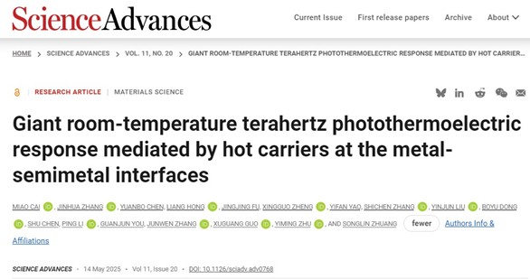 近日,上海理工大学光电学院庄松林院士领导的太赫兹技术创新团队创新性地提出了一种用于实现室温高灵敏快速太赫兹探测的新型器件及其应用。该研究成果以题为“金属-半金属界面热载流子介导的巨大室温太赫兹光热电响应”(“Giant room-temperature terahertz photothermoelectric response mediated by hot carriers at the metal-semimetal interfaces”)发表在《科学进展》(Science Advances,中科院一区,影响因子11.7)上。论文第一作者为蔡苗博士,通讯作者为朱亦鸣教授,郭旭光研究员。