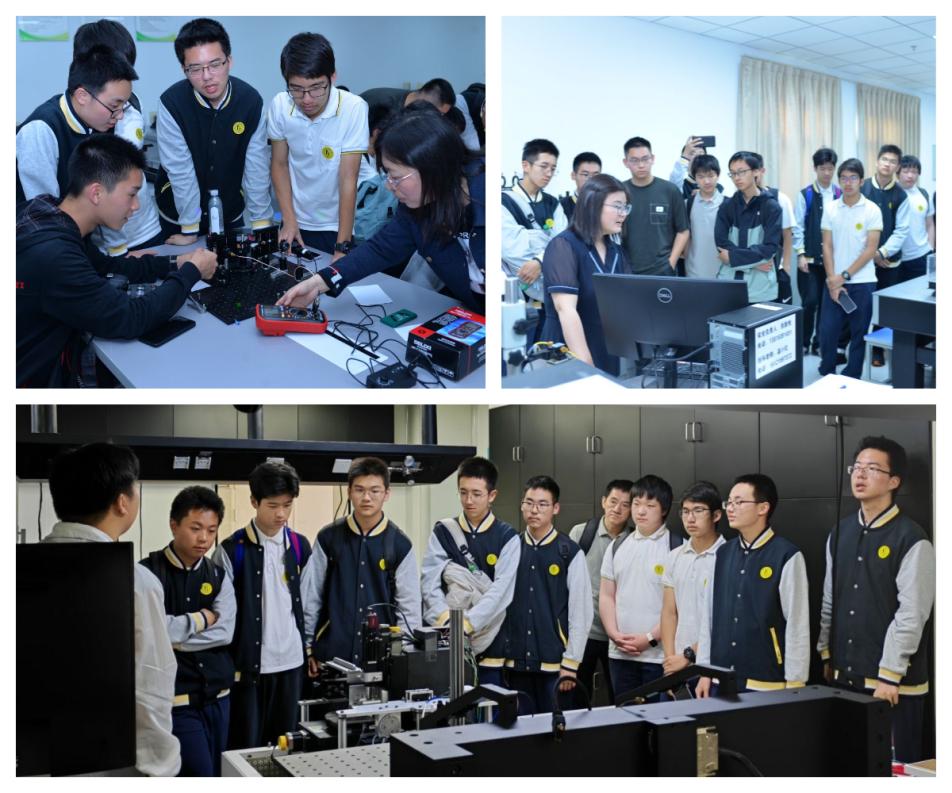 下午,科技节活动接待了上海市控江中学“致海书院”学生研学实践活动。同学们聆听了《追光一甲子,拳拳报国心》未来光学科学家精神报告和《光的波粒传奇——从微粒波动之争到太赫兹技术前沿》科普讲座后,进入本科实验教学中心。在韩朝霞老师的带领下,他们初识光谱技术,用光学元件搭建简易的扫描式光谱仪,直观认识了光谱仪的组成和原理,并观察到七色光谱。温小红老师展示的生物芯片检测实验,通过沉浸式操作体验,让同学们了解到生物传感器在老年疾病早筛和动态监测中的关键作用。随后,同学们来到上海理工大学太赫兹技术创新研究院,参观了研究生们正在进行的科研项目:太赫兹探测器、太赫兹超透镜、太赫兹人体安检仪、太赫兹近场扫描显微镜等。他们认真听讲、积极提问思维的火花在交流中不断碰撞。
