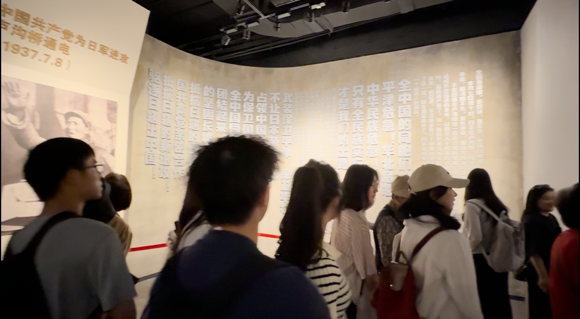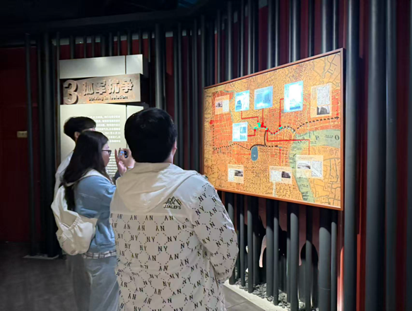 踏入四行仓库,墙体上密集的弹痕、染血的战士遗书、“抗战到底”的斑驳标语等历史细节,重现了“八百壮士”捍卫家国的悲壮场景。大家仔细聆听讲解员讲述1937年的保卫战,被“士兵与敌人同归于尽”的史实所触动。