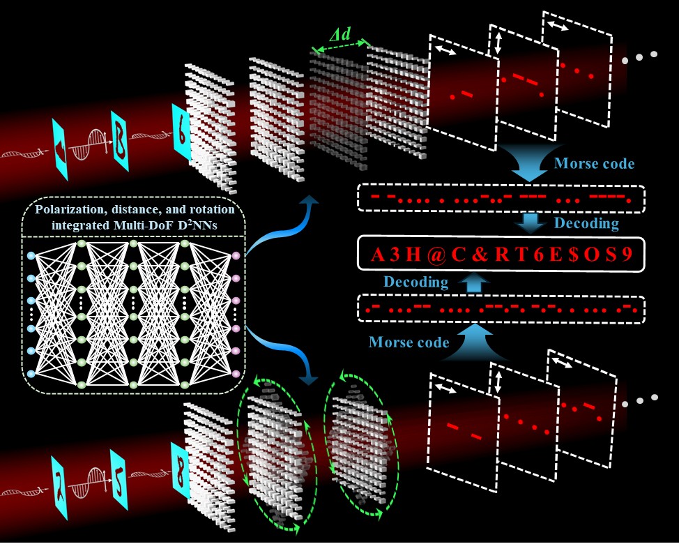 本研究针对传统衍射神经网络的自由度单一和功能集成度弱等问题,创新性地提出了基于多层超构表面多自由度融合的衍射神经网络新架构,通过集成偏振、距离和旋转三个自由度,提升了该架构的多任务并行处理容量。此外,基于Multi-DoF D22NNs构建了一套高安全性全光信息传输框架。每个通道相当于一个独立的密钥,从而将海量输入信息拆分并分配到不同的“偏振-距离-旋转”组合通道中,有效实现信息的加密。在输出层,相关信息被转换为对应的摩尔斯码图案,接收方必须同时掌握所有通道对应的完整密钥组合,才能准确地解码出原始信息。相关研究为光存储、隐私保护和网络通信提供了新范式。